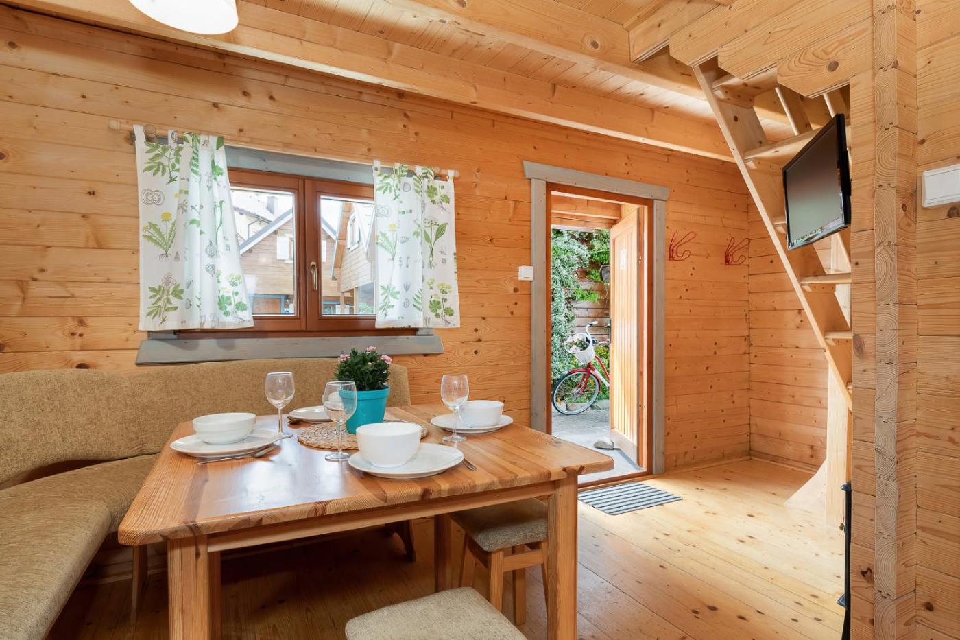 Każdy domek mieści część dzienną z sofą i telewizorem, w pełni wyposażony aneks kuchenny oraz łazienkę z prysznicem. Sypialnie na najwyższym piętrze mają skośne sufity.