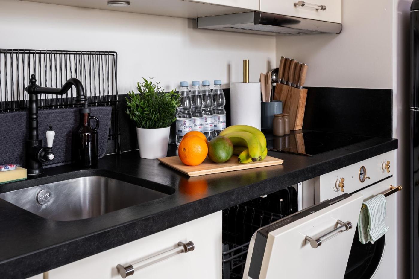 Oferta apartamentu obejmuje sypialnię (1), salon, kuchnię z pełnym wyposażeniem, w tym lodówką i ekspresem do kawy, a także łazienkę (1) z prysznicem oraz bezpłatnym zestawem kosmetyków. W apartamencie zapewniono ręczniki i pościel.