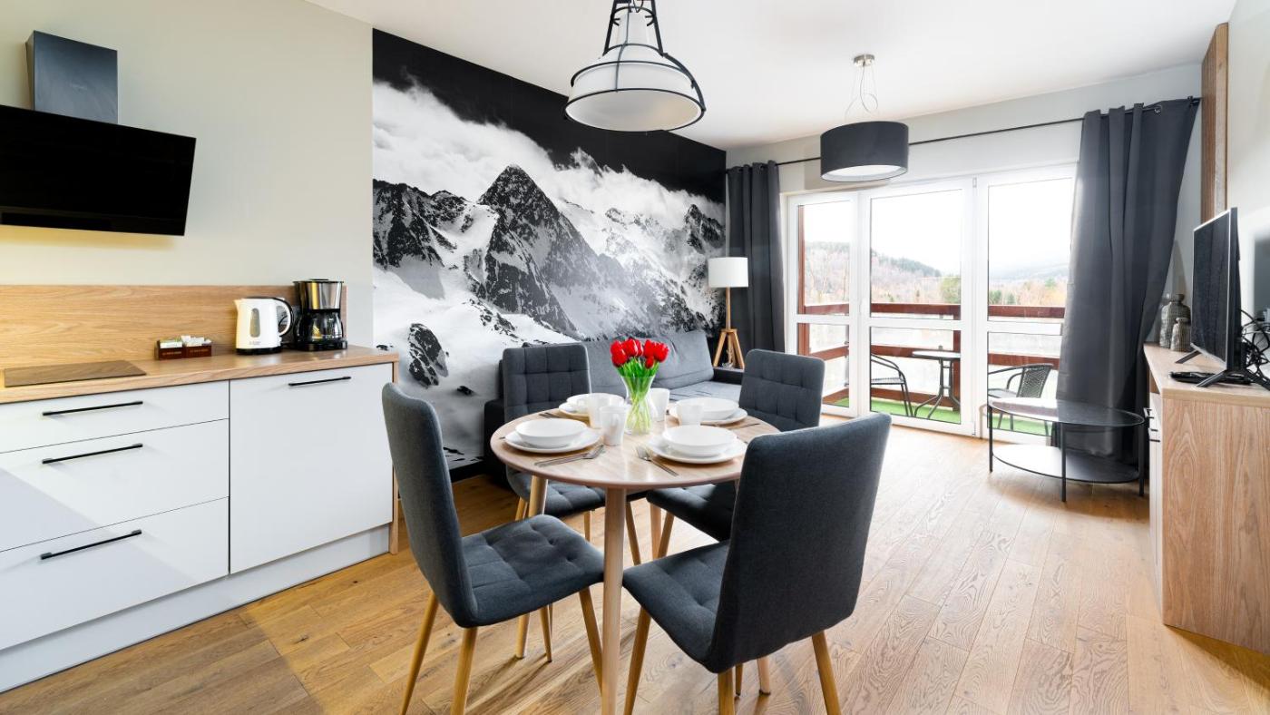 Apartament typu Deluxe z 1 sypialnią. Boasting a private entrance, this apartment features 1 living room, 1 separate bedroom and 1 bathroom with a shower and a hairdryer. In the fully equipped kitchenette, guests will find a stovetop, a refrigerator, a dishwasher and kitchenware. Featuring a balcony with mountain views, this apartment also features a tea and coffee maker and a flat-screen TV with satellite channels. The unit has 2 beds. Apartament - 4 osobowy. Powierzchnia pokoju ok.: 33 mkw.